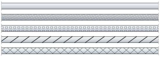 Despite the noticeable differences in the design of layered cables and monolithic sensors, the same requirements should be placed on them for monitoring cracked concrete. First of all, they must provide high accuracy ensured by the best possible strain transfer from the host material (concrete) to the measuring fibre inside. For example, a rough outer surface can increase the bonding properties between the concrete and the DFOS tool, supporting the adhesion by mechanical clamping (such as ribs in reinforcing bars). Instead of a smooth surface, additional roughening may be achieved by sand grains, perforated grooves, or external braids. The examples of ideas of possible outer surfaces are summarised in Figure 8.