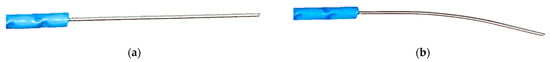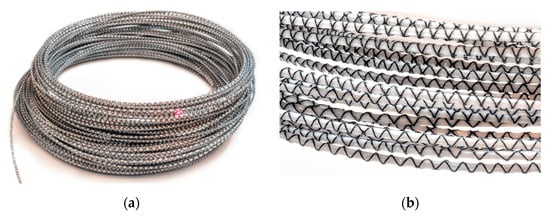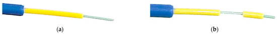 The higher the strains, the higher the probability of slippage. On the other hand, elastic–plastic metal coatings are able to deform permanently. For example, the yielding point of steel is equal to only 0.2%, while crack-induced strain peaks exceed this value multiple times. During intense tension, according to Poisson’s law, they also clamp around the fibre. Finally, the strains along the fibre can be kept even after removing the force (closing the cracks). Figure 11a shows the layered cable with steel insert before deformation, while Figure 11b shows the cable deformed in a permanent (plastic) way.