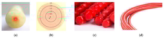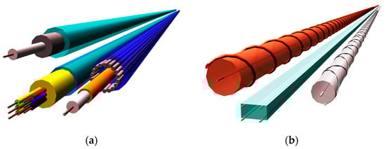 The review of DFOS tools available on the market indicates that their technical design differs significantly. Figure 14 shows the spatial visualisation of selected examples of layered cables (Figure 14a) and monolithic sensors (Figure 14b). It should be remembered that the initial concepts of these two solutions were intended for different objectives. Even though they are currently very often used for the same purposes (e.g., strain sensing), there is a concern that the obtained results will be considerably different.