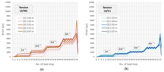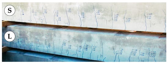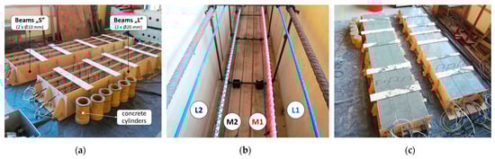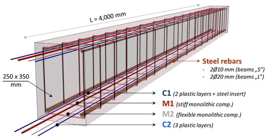 The research described hereafter was aimed at directly comparing four DFOS tools embedded in the same reinforced concrete members. It was one of the first attempts in the world to use commercially available layered cables and monolithic sensors arranged parallelly to monitor structural strains and cracks. A total of six beams with a rectangular cross-section of 250 × 350 mm and a length equal to 4 m were made, equipped with two sensing cables (C1 and C2; see Section 2.2) and two monolithic sensors (M1 and M2; see Section 2.3). The tools were installed both in the compression (upper) and tension (lower) zone of the beams. The spatial visualisation of the specimen is presented in Figure 15. Beams were differentiated by the diameters of the main reinforcing bars. Three beams, called “S”, have smaller diameters (2 × Ø10 mm), while the next three, called “L”, have larger (2 × Ø20 mm). The aim of that approach was to obtain different crack patterns, both in terms of their widths and spacings. For L-type beams, more cracks were obtained with smaller spacings and widths. On the other hand, for S-type beams, fewer cracks with greater spacings and widths were obtained.