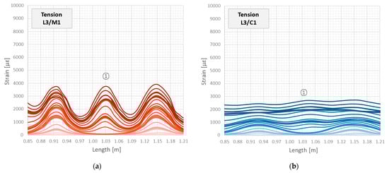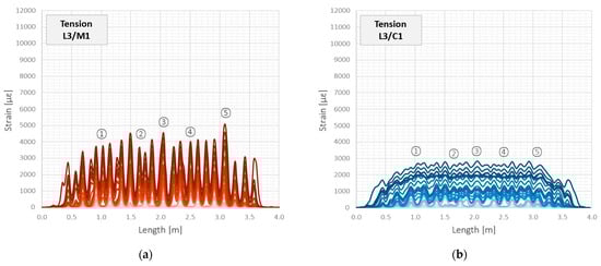 While performing structural measurements, the presence of each layer should be justified. For example, a perforated outer surface is aimed to improve bonding properties with the surrounding concrete. The original concept of layered design and its substantive justification was presented in patents [,] and further publications [,]. The presence of layers influences the strain transfer [,], reducing the high peaks and, thus, the risk of fibre breakage. This effect is caused by the geometry, material properties and possible slippage between layers. Figure 10a shows the stripped three-layer cable, while Figure 10b shows the possible slippage between the intermediate and internal layers. Such an effect can uncontrollably increase the effective length in the DFOS-based crack analysis.