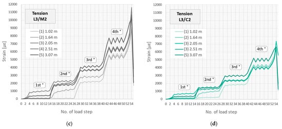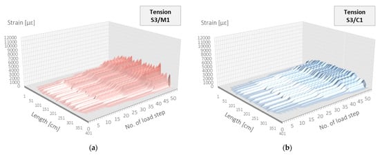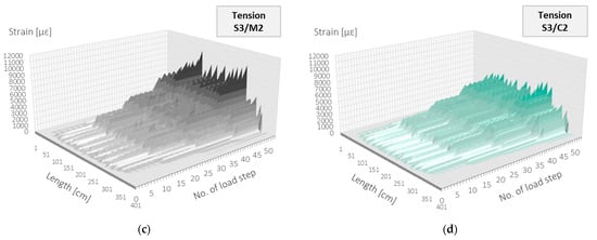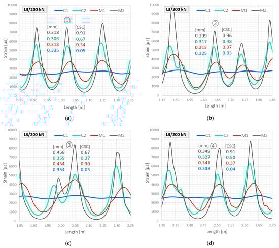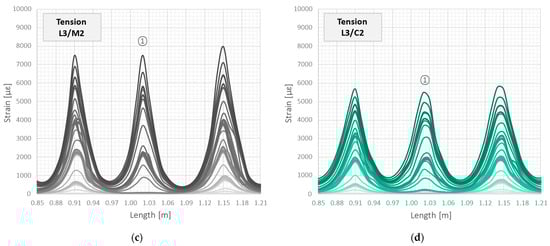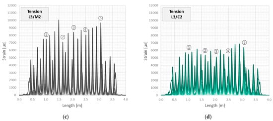 The above ability indicates the need for a custom design of layered cable depending on the application and predicted strain values within the structure in question. Selection of the layers’ number, their mechanical parameters (the material), and geometry (thickness) should be performed with caution because it will influence the interpretation of measured strains, which will differ from the actual structural strains. The literature, for example [,,,], provides a number of advanced mathematical–physical models and equations to describe strain transfer through a set of layers with different parameters. In order to align the results to the observations as well as possible, some of them must consider interlayer slip and the post-yielding behaviour of the materials. Usually, such models produce significant uncertainties and are challenging to apply in practice for analysing individual cracks suspected of cyclic load changes.