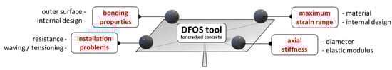 The next requirement is the high-strain range, as local crack-induced strain peaks can achieve even 30,000 µε or more [,]. The DFOS tools should withstand such conditions without the fear of breakage. That is why the materials used to build a given tool should be characterised by a wide strain range. For example, plastic or steel layers yield approximately 2000 µε, clamping around the fibre and preventing it from correct measurements of the actual state of the structure. This effect is especially worrying during long-term measurements of cracks suspected to the cyclic changes in their widths.