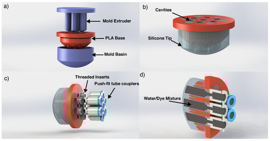 CAD views of the ESPRESS.0 fabrication process. (a) An uncured silicone mixture is added to the mould basin, the base and extruder are then clamped onto the basin. The mould parts (blue) may be used to fabricate another ESPRESS.0 tip. (b) The silicone cures in the negative space, leaving cavities in the tip. (c) The tip is prepared for watertight coupling to 2 mm OD tubing. (d) Cross-section showing the cavities filled with the water/dye mixture before silicone tubing is attached.