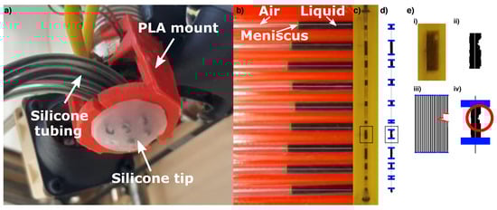 (a) The ESPRESS.0 mounted to a Cartesian arm, with the tubes channelled to pass in front of a camera. (b) The camera monitors the position of the liquid the channels against a red housing. (c,d) A single channel against a yellow housing has multiple menisci to increase the tracking range and smooth any noise. The image is processed to produce the menisci positions in blue. (e) Marked section of c and d showing the process (i) from camera frame (ii) converted to monochrome (iii) splitting to 20 vertical strips and finding edges (iv) to filtering out noise and artefacts.