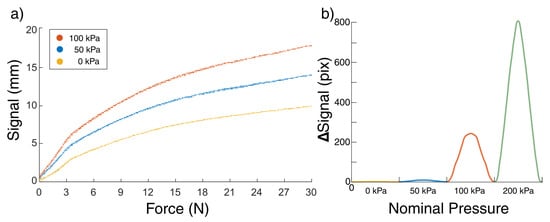 Changing behaviour when applying an internal pressure to a 2.5 mm sensitive membrane. (a) The signal (observable movement of the meniscus) is significantly increased when the back-pressure is doubled. The graph shows all data collected over 10 palpations of the F/T sensor at 3 nominal pressures. A function was fitted to each of these curves so that the force could be calculated from the and signal. Under 3 N, the three states of nominal pressures 0, 50, and 100 kPa have approximately constant stiffnesses of 2.02, 1.18, and 0.56 N/mm, respectively. (b) 1 s oscillations between 35 and 40 N. At high forces, a back pressure can be applied ad hoc to recover sensitivity. With no stimulus present, a 200 kPa internal nominal pressure is likely to break the silicone membrane.