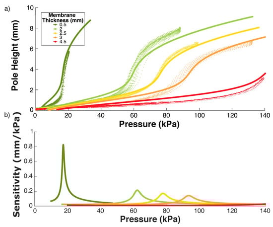 (a) Experimental data (markers) and modelled curves (solid lines) with Ogden parameters , , = 37,500, []. (b) Examination of the sensitivity of the membranes for each thickness tested. The membrane has the largest volume change in reaction to an applied force during the steepest stage of the expansion.