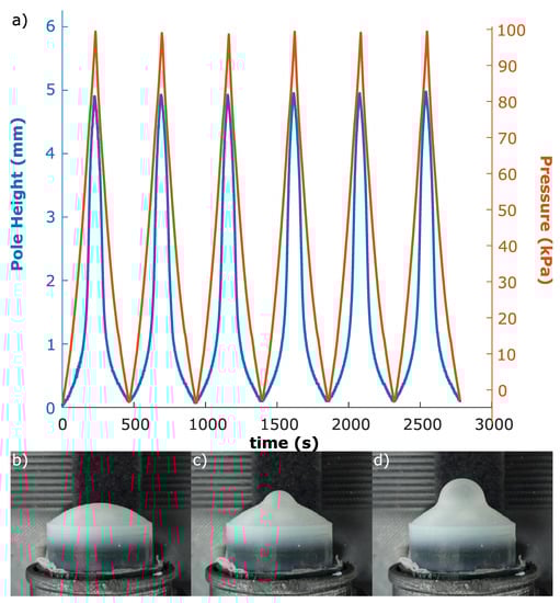 (a) Synchronised optical tracking and pressure data for six repeated cycles between high and low pressure on a 2.5 mm membrane. The similarity of the cycles indicates that the response is repeatable. (b) Low, (c) medium, and (d) high pressure state stills of a 2.5 mm membrane.
