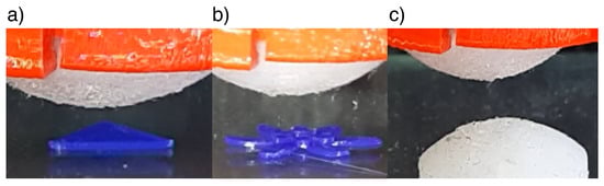 The precision of shape reconstruction is dependent on the stiffness of the stimuli being detected; if the stimulus is significantly softer and more compliant than the ESPRESS.0’s silicone membrane, then it may deform more than the sensor tip. We tested stimuli with two different values of hardness. The stimuli consisted of objects made from PLA (80 D hardness [], hard stimuli) and cast from silicone (DragonSkin 10, Smooth-on, 10 A hardness [], soft stimuli) (Figure 8). Hard stimuli were 3D printed directly onto the testing surface, where they could be palpated, whereas the soft stimulus was cast from the 10 A silicone (DragonSkin 10, Smooth-on) using a 3D printed mould. The soft stimulus was shaped as a spherical cap, so that a circle could be fitted to the shape in the plane perpendicular to the xy plane along any chord of the shape’s 2D circular projection in that plane. This physical radius should be reflected exactly in the tactile data. The radii of the circles extrapolated from the data using the Landau-Smith method [] were compared to the radius of the mould used to make the silicone stimulus in order to assess the accuracy of the sensory data compared to the real object (Figure 9).