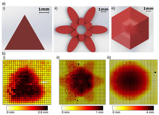 Hard Stimuli: The tip was able to detect and reconstruct features of the shapes on the sub-millimetre scale (Figure 10). Changing the back-pressure of the sensor made little difference to the ability to sense a hard object’s shape. At each pressure, the sensor was capable of finding the z-distance of each object to within the precision of the Cartesian robot (0.03 mm).