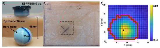 Once the boundary of an object has been detected, a palpation can be carried out to determine the stiffness of the object in that location. The utility of this was demonstrated using a 45 mm deep tissue-mimicking sample (Polycraft Silskin 10 silicone rubber) with an elastic modulus of 12 kPa, embedded with a hard synthetic spherical node of 25 mm diameter at its base. Thus, the node had a minimum depth of 20 mm from the surface at its closest point, and a maximum of 32.5 mm at its equator. In this controlled test case, the range of expected stiffnesses was known and so the untethered ESPRESS.0 (Section 2.1.2) was used to demonstrate the potential for this platform to be used to carry out untethered palpations. The untethered ESPRESS.0 carried out a palpation in the z-axis at the centre of each mm coordinate in the xy plane over a predefined area of the sample. This particular palpation technique was selected for its simplicity and repeatability in order to demonstrate the suitability of the ESPRESS.0 to the task of embedded lump detection and localisation.