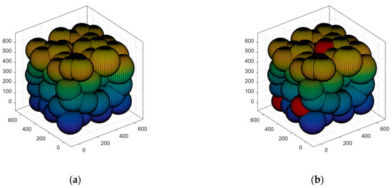 We use cubic space to simulate the 3D deployment scenario in the field. According to Figure 1, the network suffers from a high degree of aggregation after random deployment. The coverage is optimized using a suitable scheme. To lower the deployed quantity of nodes and minimize the energy consumption of a single node, the sensing radius of the nodes can be made to adjust adaptively because of the actual demands. In turn, the network’s QoS can be improved. Subsequent research is carried out based on this scenario.