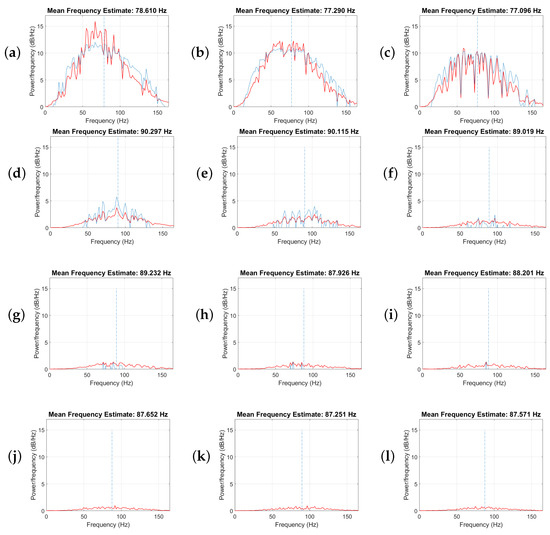 To analyze the effect of each singular value on the energy of each frequency for the data presented in Figure 1, data were decomposed into their singular matrices and recovered with each singular value from 1 to 15 separately. Then, the energy per frequency or power spectrum of the recovered data with each singular value is calculated. In Figure 5, the red line represents the graph of frequency energy per frequency, and the blue line shows the estimate of the mean normalized frequency of the power spectrum. Figure 5a is the result of recovering data with the first singular value. Figure 5b shows the energy per frequency for the recovered data with the second singular value. Figure 5c is the energy per frequency for the recovered data, including just the third singular value. The estimated mean frequency for these first three singular values is 77 Hz. Figure 5d–f represent the energy per frequency for the recovered data, including just the 4th, 5th, and 6th singular values, respectively. The estimated mean frequency for these singular values is 90 Hz. Figure 5g–i indicates the energy per frequency for the recovered data, including just the 7th, 8th and 9th singular values, respectively. The estimated mean frequency for these singular values is 88 Hz. Figure 5j–l show the energy per frequency for the recovered data, including just the 10th, 11th, and 12th singular values, respectively. It is clear that most energy of the useful signal is recovered with the first three singular values. Nevertheless, the shift in the mean frequency from 77 to 90 Hz states that there is leakage for the higher frequencies in the data. We conclude from this test that despite the remaining residual errors in the presence of the additive noise, we need to choose the rank of the block Hankel matrix to be greater than the number of linear events in each processing window of frequency and space.
