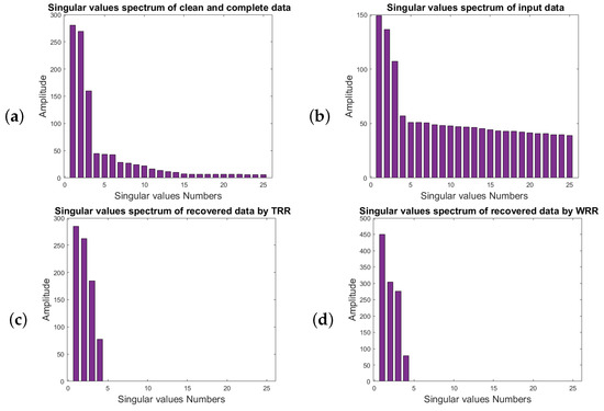 Figure 10 corresponds to the spectrum of the first 25 singular values of the block Hankel matrices of Figure 9. Figure 10a represents the singular-value spectrum of the block Hankel matrix of clean and complete data for the frequency of 50 Hz. The abrupt drop in energy of the third and the fourth singular values relates to the useful signal. However, there are still nonzero singular values that are related to the useful signal. Figure 10b is the singular-value spectrum of the block Hankel matrix of noisy and incomplete data. Figure 10c shows the singular-value spectrum of the noisy and incomplete data after TRR with rank = 4. Figure 10d displays the singular-value spectrum of the noisy and incomplete data after applying WRR with rank = 4. Figure 10e depicts the singular-value spectrum after applying ARR. Figure 10d indicates the singular-value spectrum of the noisy and incomplete data after the implementation of the AWRR method. From the figures, one can see that the result of AWRR is more comparable to the corresponding result for the desired signal in Figure 10a.