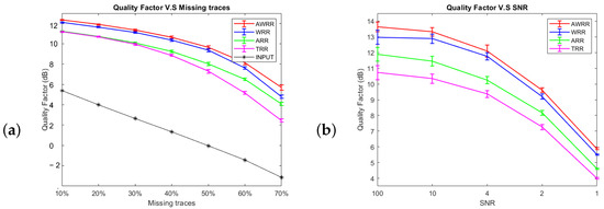 To evaluate the stability of each algorithm, we ran them with different percentages of gaps and noise realizations for an SNR of two. The other parameters were constant for each run. Figure 13a shows a graph of the interpolation quality factor for each method versus the gap ratio. The length of the error bars is the standard deviation of the interpolation quality factor, and each colored line connects the mean value of the interpolation quality factor for each method at each gap ratio. As we can see in Figure 13a, the input quality factor decreases with increasing gap ratio, and the output quality factor decreases with increasing gap ratios. Moreover, the output quality factor curve of the AWRR method is always above the other curves.