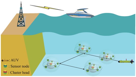 As shown in Figure 1, we consider an AUV-based multi-modal data collection network where the deployed nodes are classified into ordinary nodes , cluster heads and sink node according to their different functions. The sensor nodes are statically deployed on the seabed using anchor chains, where the locations of the nodes are assumed to be known. The CHs perform intra-cluster data fusion and data compression [27] and then wait for the AUV to arrive and collect the data. In particular, during the network formation phase, all sensor nodes are divided into multiple clusters based on spatial distance, and only one node in each cluster is selected as the CH, while other nodes are used as ordinary nodes for data collection [32]. The AUV performs global data collection around all CH nodes and finally reports the data to the sink node.