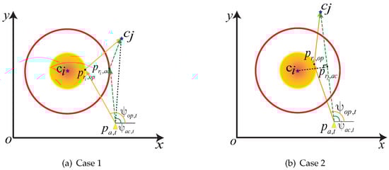 The AUV multi-modal steering angle diagram. (a) The trajectory of the AUV from the current coordinates towards the next target will not sail through the communication region of . (b) The trajectory of the AUV from the current coordinates towards the next target will sail through the communication region .