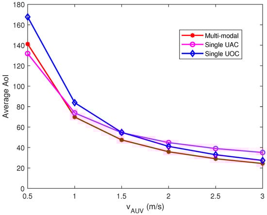 To explore the effect of AUV velocity on the average AoI, we simulated the average AoI performance of the collected data with data arrival rate = 20 and 300 Kbits. The experimental results are shown in Figure 4, where it can be observed that the average AoI of the data collected by AUV gradually decreases with increasing AUV velocity. The weighted average AoI of the single UAC is lower than that of the multi-modal and single UOC when the AUV speed is 0.5 m/s. With the increase of the AUV velocity, the average AoI of the multi-modal data collection scheme is better than that of the single communication option.