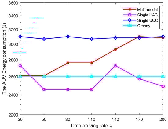 Under the parametric conditions of Figure 4, we analyzed the effect of AUV velocity on the energy consumption of data collection. Considering that the energy consumption of CHs is irreversible, we pay more attention to the energy consumption of data transmission, and therefore, we set = 0.03. As shown in Figure 5, it can be observed that the weighted energy consumption of the single UAC scheme always remains at the highest level owing to the high weight of data transmission energy consumption. The single UOC scheme performs well in terms of CHs data transmission energy consumption, and hence, the weighted energy consumption is better than the single UAC scheme. The multi-modal scheme is able to reduce both AUV energy consumption and CHs data transmission energy consumption by jointly deciding on the best communication option based on packet size and path length. Furthermore, with the increasing AUV velocity, the weighted energy consumption of the three schemes will be convergent, since the AUV power increases geometrically with the velocity of travel.