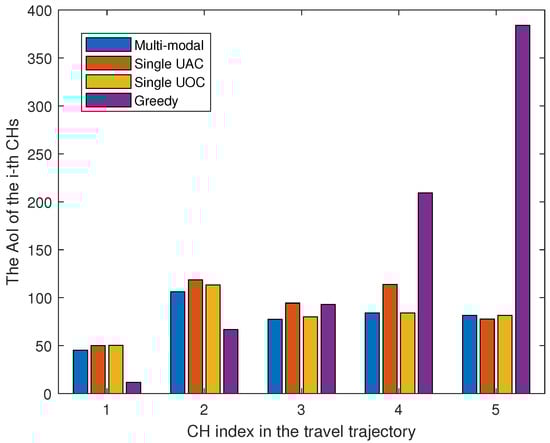 The primary reason for this performance is that the AUV travels slower and increases travel time, whereas the long-distance data collection via the single UAC is able to reduce the travel time of the AUV, which mitigates the increase in AoI. As the AUV velocity increases, the effect of AUV travel time on AoI is weakened, which makes the weight of data transmission time increase for AoI; thus, the UOC scheme outperforms the UAC scheme at higher AUV velocities. The multi-modal data collection scheme selects the best communication option according to the data characteristics, AUV navigation time and data transmission time so that the overall performance is better than the single-modal scheme. Furthermore, the average AoI of our proposed multi-modal data collection scheme at the AUV velocity of 0.5 m/s is inferior to that of the single UAC scheme; this is because the multi-modal scheme not only considers AoI but also focuses on data collection energy consumption, so it sacrifices some AoI performance to reduce CHs energy consumption.