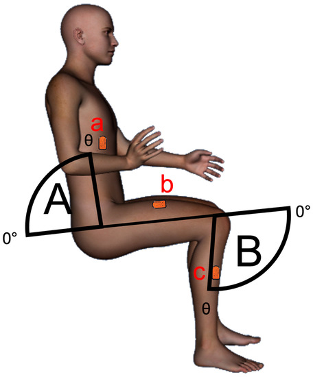 A depiction of activPAL monitor placements on the torso (a), thigh (b), and shin (c). The hip and knee flexion angles were calculated from the torso–thigh (A) and thigh–shin (B).