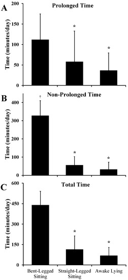 Time spent in bent-legged sitting, straight-legged sitting, and lying across prolonged sedentary bouts (>1 h; panel (A)), non-prolonged sedentary bouts (<1 h; panel (B)), and total time (panel (C)). Time across each position and between prolonged and non-prolonged bouts with each position were compared via a Wilcoxon-signed rank test. * p < 0.0167 (adjusted for multiple comparisons) to bent-legged sitting. † p < 0.0167 to prolonged bent-legged time.