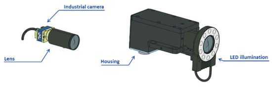 The vision system under study in this paper is a multi-camera system. Specifically, it is a stereo-photogrammetric solution (Figure 3 (down)). The layout is composed by two industrial cameras (Teledyne DALSA Genie Nano 4020, 12.4MP, Schneider Optics APO Xenoplan 2.8 16 mm) individually calibrated in the camera calibration scenario. Afterwards, the results need to be carried into the measurement scenario. In both scenarios, images are taken of reflective non-coded targets. The material property of these elements allows the image detection quality to be the same in both laboratory and industrial scenarios. This is also enabled by the active LED illumination (DCM ALB0810A) integrated by each measuring camera system (Figure 3 (up)). In addition, the camera is encapsulated in a housing manufactured for industrial scenario cases, and thus more efficiently mitigates the effects on the device caused by temperature, humidity, or vibrations. Even so, the tests carried out in this work have been conducted in a controlled laboratory where the above noise factors are mitigated as much as possible.