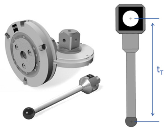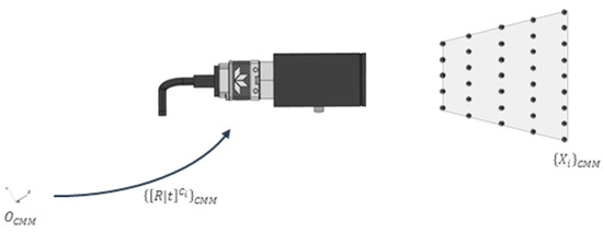 A retroreflective target (10 mm diameter) is placed on a previously calibrated probe (in CMM Zeiss O-Inspect). The uncertainty of the movement process is 0.8 µm (1-sigma). The offset obtained here makes it possible to know the 3D position of the target in the CMM coordinate system (Figure 6). This target is placed in certain predefined 3D positions generating a virtual calibration pyramid, where the corresponding image is taken. This pyramid is defined by 10 planes and 10 marker positions in each, a total of 1000 positions.