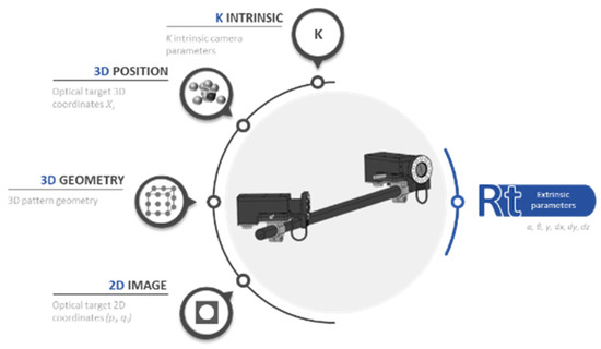 For each camera, the 3D coordinate can be projected into the corresponding camera 2D image plane as and coordinates, following the widely assumed pin-hole conic projection model in machine vision [34]. This solution can be solved through a non-linear approximation as previously cited. Thus, the partial derivative of an optical target projected on the image with respect to its spatial coordinates is formulated as follows as: