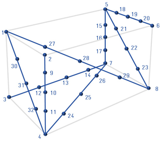 The positions of the bar are limited by a cube, which is defined by the range of the system. This cube, in turn, defines the length for the bars. The standard is modified to virtually generate the bar using a CMM (Figure 10). It is composed of 32 points for a working area of 215, 320 and 292 mm in x, y, and z of the CMM axis, respectively.
