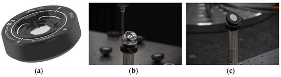 The measurement process consists of probing a 1.5″ (38.1 mm) stainless-steel sphere on the CMM, defining its centre (see Figure 11b), and then swapping it with a 1.5″ (38.1 mm) Split Bearing Retro-reflective (SBR), detectable by the photogrammetry system (see Figure 11c). This way, it would be possible to define a common and comparable nominal centre between both metrological tools.