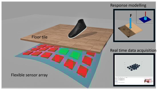 General scheme of the smart floor system. A flexible sensor matrix is attached to the bottom of a floor tile, allowing real-time position sensing of steps or any kind of pressure applied. The generated data are sent (wirelessly) to a computer for signal analysis. This data allows the development of a digital model of the system that can be used to further optimize the sensor array to the specific requirements (e.g., sensitivity, resolution) of the target application, thus avoiding unnecessary prototyping and saving costs and time.