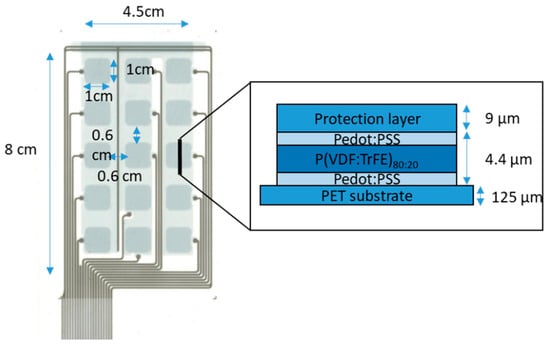Top view of the sensor matrix and schematic of the layer stacking in one of the pixels (the layers are not in real scale). The printed device consists of a common bottom electrode for all pixels out of PEDOT:PSS, a continuous layer of P(VDF:TrFE)80:20 (not visible on the image) and 15 top electrodes out of PEDOT:PSS, corresponding to the 5 × 3 sensor pixel elements. The top electrodes are squares with 1 cm side length and 0.6 cm gaps between them. Every top electrode corresponding to a single pixel is independently connected via printed silver lines. The active area of the matrix is then 4.5 cm by 8 cm. The whole device, including substrate and protection layer, is around 140 µm thick.