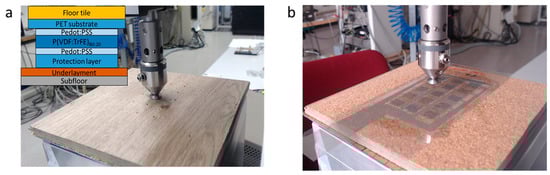 After fabrication of the sensor matrix, the transducer was cut and glued to the bottom of a floor tile (Modular ONE, Parador GmbH, Coesfeld, Germany) with a layer of commercial wood glue (Redocol) (see Figure 3). The device was then left to dry at room temperature for 24 h.