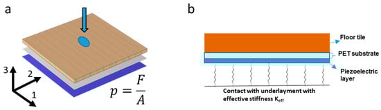 The use of piezoceramic materials, such as PZT, in smart floor environments for sensing or energy harvesting is not a new topic [6,23,24]. In this context, piezoelectric polymers, such as polyvinylidene fluoride (PVDF) and its copolymer poly(vinylidene-trifluoroethylene) (P(VDF:TrFE)), are of special interest. In contrast to piezoelectric ceramics, the piezoelectric polymers are highly flexible, can be printed from solution on foil substrates in various shapes, and need only low processing temperatures of around 135 °C [25]. Printing techniques, such as screen printing, enable large sensor areas with complex pixel array designs [26]. These techniques make it easier to adapt the sensor layout to the particular case. At the same time, flexible devices can be conformably applied to the targeted surfaces by gluing or lamination, thus avoiding bulky mechanical constructions. Previously, we integrated P(VDF:TrFE)-based sensors in floor tiles in an augmented floor [27], whereby the sensors were reacting on the users’ stepping or jumping. The respective response signals were processed by the AI to produce an auditory augmentation of the motion. An in-depth modeling of the sensor response to pressure and force excitations was not part of this study.