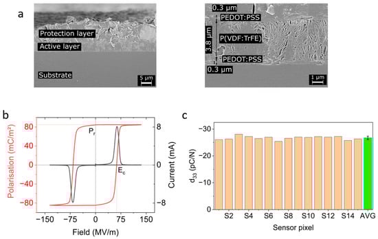 Figure 5a displays SEM images of the cross section of a representative pixel element with the screen-printed layer stack. The actual transducer has a thickness of 4.4 µm; it comprises a 0.3 µm thin top and bottom electrodes made of PEDOT:PSS and the piezoelectric layer made of P(VDF:TrFE) with 3.8 µm thickness. The thin-layer thicknesses were achieved by using adequate mesh types based on the individual layers’ ink viscosities; see Section 2.1. The lamellar structures typical for the ferroelectric β-phase P(VDF:TrFE) are clearly visible [37].