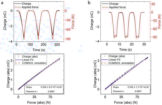 Temporal response of the central pixel for movement speed of (a) 10 µm/s and (b) 150 µm/s. On top, force and collected charge are plotted against time. On bottom, charge vs force is plotted, also including a linear fit to the experimental values (red dashed line). In blue, the simulated charge output is shown. We see both lines are close but start deviating as the force is increased. In both cases, the simulated output overestimates the experimental value. At the same time, we observe the charge output is the same for both velocities.