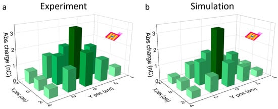 To study the distribution of the pressure through the floor tile into the sensor foil, we measured the responses of all individual sensor pixel responses sequentially without moving stamp and tile. The resulting distribution over the sensor matrix is shown in Figure 7a. Even though the stamp size was similar to that of a single pixel, the charge response was not strongly concentrated over the central pixel but rather spread over the whole matrix. At the most distant outer pixels at (X,Y) = ±(1.5, 3) cm, the response had still ~1/6.6 of the magnitude of the central pixel. Quantifying this lateral spread is important to determine the minimum density of sensor pixels required to resolve specific mechanical stimuli of interest while reducing the crosstalk between pixels. The FEM model could reproduce the value at the central pixel with an error of 1.5% (see Figure 7b). The crosstalk was underestimated in this model, though with a far higher error in the signal of the closest neighbors.