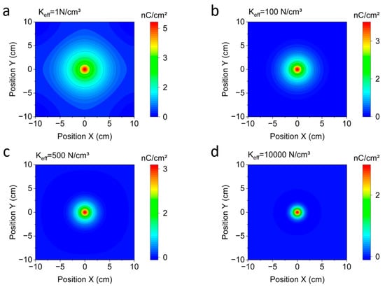 To analyze how the choice of the underlayment’s parameter, Keff, affects the lateral distribution of charge response in the model, we varied the value of this parameter and evaluated the piezoelectric polarization in the continuous piezoelectric layer. As shown in Figure 8, lower values of stiffness resulted in higher polarization values over wider areas. On the other hand, a stiffer underlayment concentrated the polarization under the compressed area, and thus, crosstalk was reduced. Still, it was not possible to completely fit the simulated values to the experimental ones. Changing the lateral clamping conditions did not change this fact either. A stronger restoring force applied laterally only increased the stiffness of the boundary, resulting in a reduced spread of the polarization. This might point out the limitation of a single parameter modeling of underlayment.