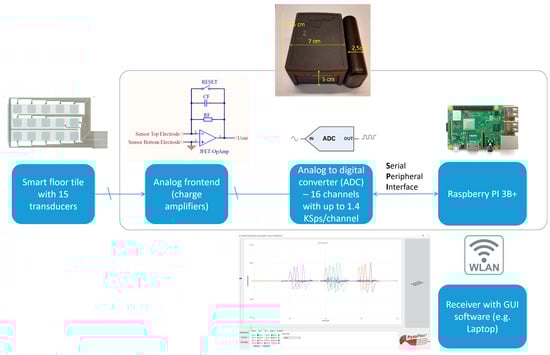 A development kit (Joanneum Research, Graz, Austria) was used as a data logger to record the charge responses of the smart floor tile sensor matrix during demonstration. It was comprised of a Raspberry Pi 3B+ carrying a self-developed hock-up board containing the analog input stages and a multichannel analog-to-digital converter (ADC). The ADC samples with up to 1.4 kSps/channel at a 24-bit vertical resolution. The Raspberry PI communicates with the ADC on the hock-up board via a serial peripheral interface (SPI). A total of 16 optional sensor signals can be read upon amplification by an operational amplifier circuit (JFET-based). To this end, a charge amplifier circuit (charge-to-voltage converter) with a feedback capacity of C = 1 nF was chosen. The system was powered by a battery pack (5 V supply voltage) with a charging capacity of 5000 mAh.