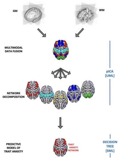 In recent times, affective neuroscience has taken advantage from the application of multi-variate machine learning approaches (also named multi-voxel pattern analysis in the context of neuroscientific research) which allow researchers to test how distributed patterns across multiple voxels relate to experimental variables [29]. Compared to traditional univariate analyses, machine learning approaches have the benefit of being multivariate in nature as they perform a joint analysis of multiple voxels, while univariate approaches carry out separate analyses for each individual voxel; moreover, the generalization of results is not assumed, but empirically tested [29,30]. Based on the considerations stated above, the main purpose of this paper is to provide new fresh evidence on the neural bases of trait anxiety by using a combination of unsupervised and supervised machine learning approaches applied to gray and white matter features in a data fusion perspective. The aim is not only to explore the neural bases of anxiety, but also to extract a neural model to predict trait anxiety. As such, this model can pave the way for the creation of a potential biomarker to predict new cases [29,31].