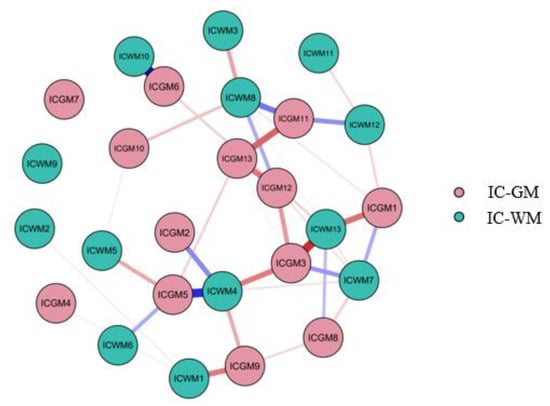 Specific values for centrality measures are reported in Table 3. Regarding the centrality parameters, providing insight into the relative importance of a node with respect to the others [70], IC-GM5 and IC-GM11 show high levels of degree and expected influence and a small level of betweenness, while IC-WM8 shows a modest level of betweenness and degree but a moderate level of expected influence. IC-WM4 shows a higher number of connections with respect to IC-WM8, with a high level of strength and betweenness. Considering the centrality measures cited above and the network plot, it appears that network 1 (IC-GM5/IC-WM4) and network 2 (IC-GM11/IC-WM8) constitute two important hubs, along with network IC-GM3/IC-WM13, which also shows a great number of strong connections and a high expected influence.