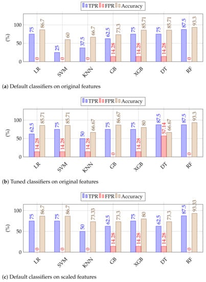 We summarize our obtained results in Figure 10. In Figure 10a, we show the results of chosen classifiers (with default parameters) on the original features (without scaling). In this setting, we achieved as high as 87.5% TPR at the cost of 0% FPR hence leading to an accuracy of 93.3% by RF classifier. Logistic regression ended up as 2nd best here attaining an overall accuracy of 86.7% (TPR of 75% and FPR of 0). In Figure 10b, we show the obtained results on the same original features but with classifiers trained on optimal parameters. Further in Figure 10c,d, we show the results of classifiers (with default features) and tuned classifiers on scaled data, respectively. As some of the classifiers, e.g., SVM, are not robust enough to high variance and work generally well on scaled data, we see a bit of improvement whereas some classifiers (DT, RF) are extremely robust to these experimental conditions hence they equally perform well scaled/unscaled data. Here we see that RF remained consistent in all experimental settings, and yielded comparatively a higher accuracy of 93.33% (87.5% TPR at the expense of 0% FPR). It is worth mentioning that SVM using optimized parameters, attained 87.5% TPR as RF however it has a higher FPR of 14.28% as compared to 0% for RF.