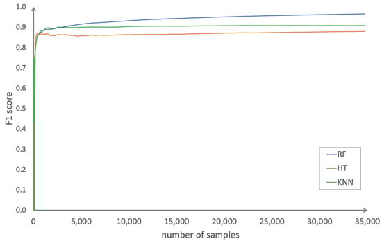 F1-score convergence for random forest (RF), Hoeffding (HT), and KNN.