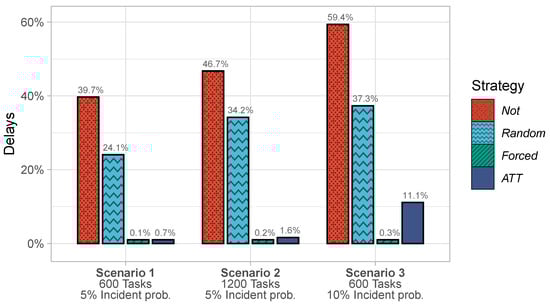 Across the three scenarios, Forced and ATT performed significantly better than Not and Random. Both Not and Random struggled in all scenarios and were affected by higher task counts and incident probabilities. ATT could handle the increase in tasks but started to struggle when the incident probability was high. Forced produced hardly any delays in any of the three scenarios.