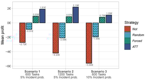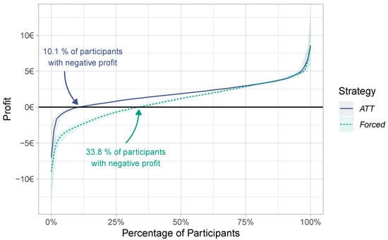 The cumulative frequency graph in Figure 6 shows how the profits in Scenario 1 under ATT and Forced are distributed over the individual participants. Under the Forced strategy, 33.8% of participants obtained a profit of EUR 0 or less; i.e., a large fraction of participants would suffer under the forced task transfers. In contrast, using ATT, only 10.1% of participants obtained a profit of EUR 0 or less.