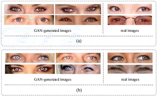 In the actual image, the shape of the pupils is mainly oval, as shown in the two right pictures of Figure 4b. The pupil regions of the actual image are marked by the white line. However, the pupils generated by GAN may have irregular shapes, as shown in the four left pictures of Figure 4b, which show the pupil shape difference between the left and right eyes. The irregular pupil shape is marked by the white lines, which would not occur in natural images.