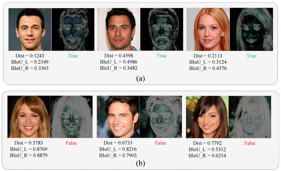 In an actual image, the pupil color of a person’s left and right eyes is supposed to be the same. However, some GAN-generated images do not consider the pupil color globally. As shown in Figure 4a, the color differences between the left and right eyes are obvious. Like the first image in row 1, the left eye’s iris is blue, and the right is brown, which does not happen in common people. At the same time, we also listed the iris colors in two authentic images. As shown in the two right pictures of Figure 4a, the iris colors of the left and right eyes are the same. Therefore, we can detect inconsistencies in terms of iris color to distinguish the GAN-generated images.