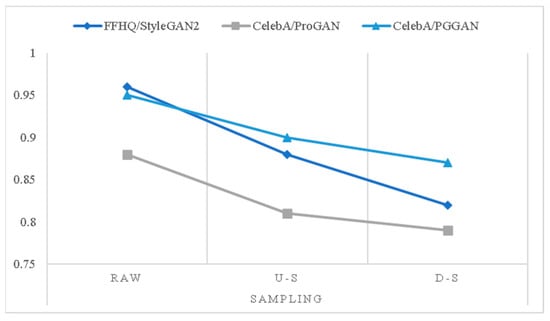 We followed the results in [40] and tested our proposed method. The detection accuracies of the state-of-the-art methods are shown in Table 9. We can conclude from Table 9 that our approach has a good performance in classification accuracy. Meanwhile, Figure 9 shows the line chart from Table 9: the X-axis represents the disturbance parameters, and the y-axis represents the accuracy. We observed that our approach is more stable in all groups. As shown in Figure 10, our approach shows better adaptability in JPEG compression, gamma correction, and other disturbances. With the limiting threshold becoming worse, such as the lower JPEG compression rate and a larger kernel size of Gaussian blurring, the accuracy of our method has little impact. It is because the physical method is not sensitive to image scaling, filling, noise, and other disturbances. The robustness of the model is improved.