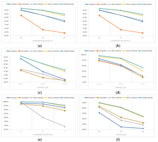 The line chart from Table 9. (a) JPEG compression. (b) gamma correction. (c) median blurring. (d) Gaussian blurring. (e) Gaussian noising. (f) resizing.